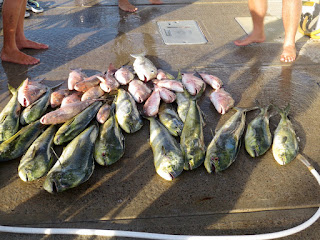 After leaving the raft we had some outstanding fishing. After only having our lines in the water for a short time. We had a 400 lb Blue marlin crash one of our teasers. It just kept crashing it and crashing it. We presented bait right by its head but it only wanted the Mud flap shaped black rubber fish on the end of the teaser. After what seemed like and eternity, The marlin made one last charge right past our baits and stole the fake rubber fish that it wanted so badly and disappeared. It was frustrating but a beautiful sight. After that we trolled for a better part of the morning catching all the Mahi ( dorado) that we wanted. We had a live well full of baits and found it best if we just stopped trolling and stopped when ever we found the fish.